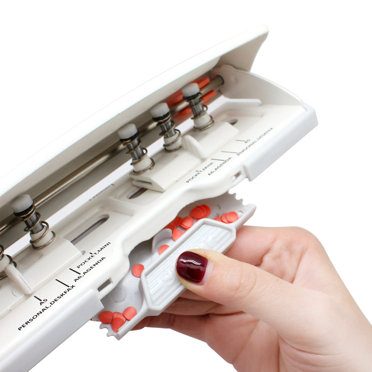 • Flip-open confetti tray makes cleanup of punched holes fast and simple.
